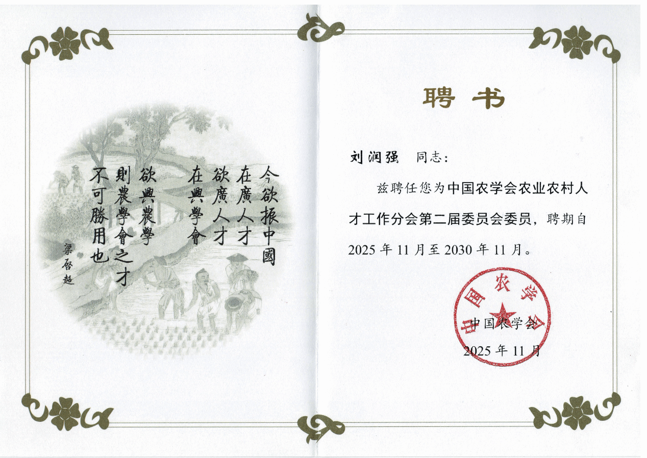 12-04我院教师刘润强获聘中国农学会农业农村人才工作分会第二届委员会委员