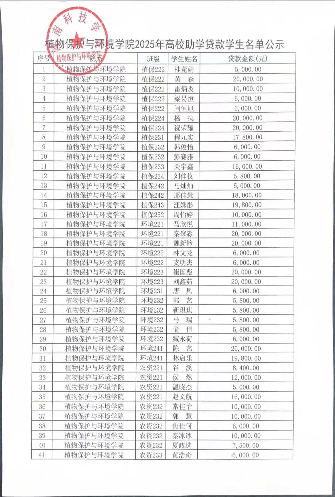 植物保护与环境学院2025年高校助学贷款学生名单公示