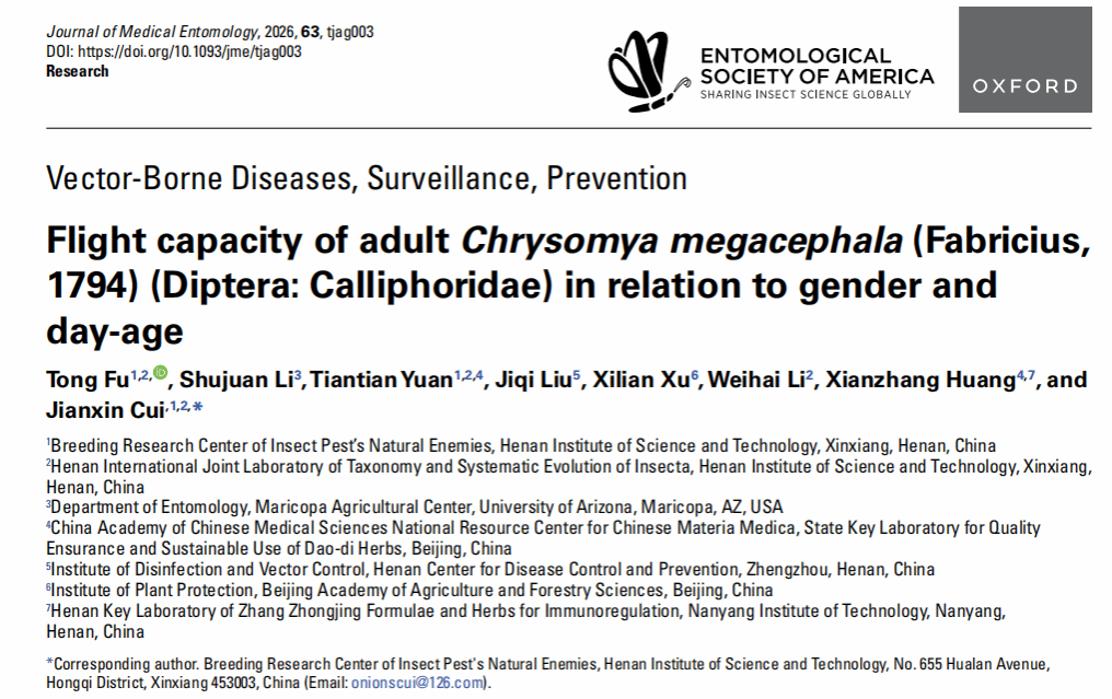近日,我院硕士研究生伏烔以第一作者在国际知名医学昆虫学期刊《Journal of Medical Entomology》(中国科学院二区)在线发表了题为“Flight capacity of adult Chrysomya megacephala (Fabricius, 1794)(Diptera: Calliphoridae)in relation to gender and day-age”的研究成果,我校崔建新副教授为通讯作者。该研究系统揭示了日龄和性别对大头金蝇(Chrysomya megacephala)成虫飞行能力的影响,为评估其扩散风险、制定精准虫媒防控措施提供了关键科学依据。