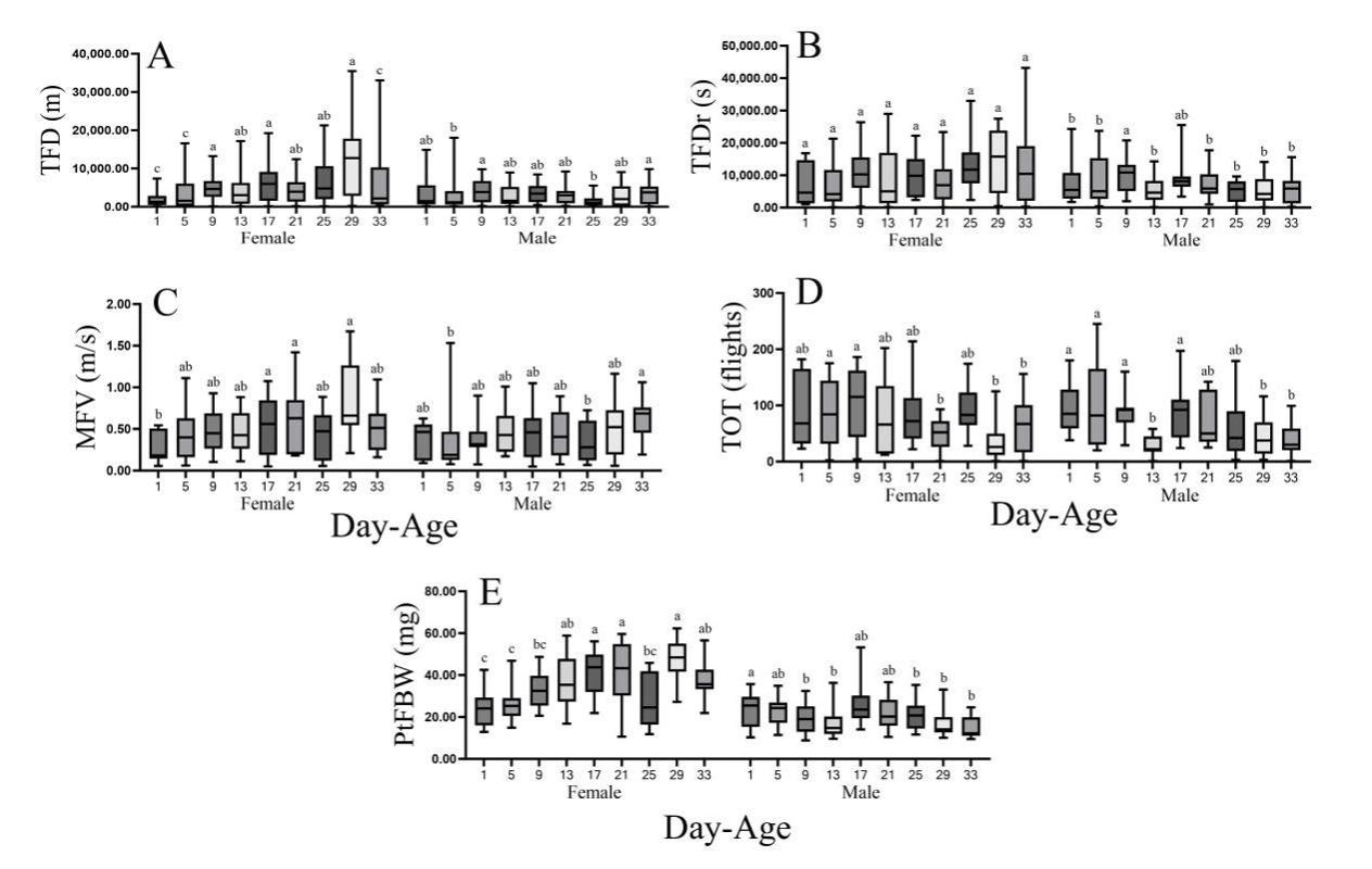 雌雄两性1~33日龄大头金蝇飞行参数的比较