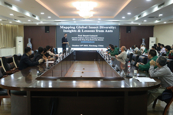 10月14日上午,香港生物多样性博物馆馆长(School of Riological Sciences Director of the Hong Kong Biodiversity Museum,China)Benoit Guénard研究员应邀参加第二届“一带一路”地区昆虫多样性格局评估与智能监测体系关键技术培训班(河南科技学院分会场),并作题为“Mapping global insect diversity:insights and lessons from ants”(全球昆虫多样性分布:来自蚂蚁的见解与启示)的学术报告。报告会在行政楼206会议室举行,植物保护与环境学院师生代表及培训班学员等100余人参加了报告会。